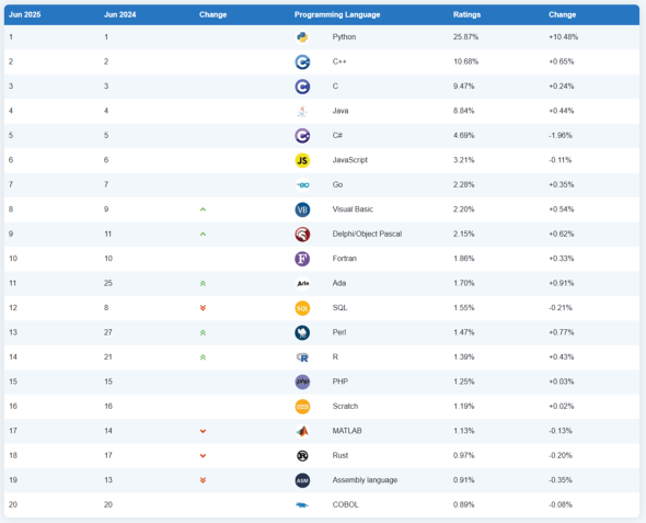 プログラミング言語の人気ランキング「TIOBEインデックス」の2025年6月版が公開された。首位のPythonが2カ月連続でPython史上最高のレーティングを獲得した一方、SQLは過去最低の12位に転落した。