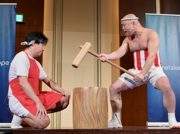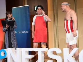 全セッション終了後の懇親会では、特別ゲストの平井理央氏(フリーアナウンサー)とお笑い芸人「クールポコ。」が登場。クールポコ。はNetskopeの法被を着て、「ゼロトラストって息巻いていたけど設定ミスで全社員スーパー管理者権限にしちゃった情シスがいたんですよ〜」「な〜に〜!? やっちまったなぁ!」「企業は黙って……」「SASE!」「それじゃあトラストしすぎだよ〜」というネタを披露し、大盛況のうちに幕を閉じた。