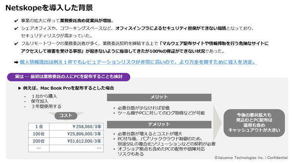 「Netskope製品導入のそもそもの目的は、社外で働く業務委託の従業員が増えてきたことに伴うマルウェア感染リスクに対処することでした。当初は業務委託含む全従業員にセキュアなPCを配布することも考えましたが、コストシミュレーション時にキャッシュアウトが大き過ぎるとの結論に至りました。その代わりにNetskopeのSASEならば、従業員の私物PCからでもインターネットに安全にアクセスできるようになるため、コスト効率が優れていると判断しました」