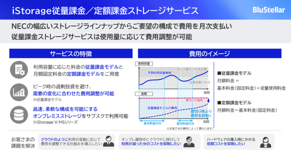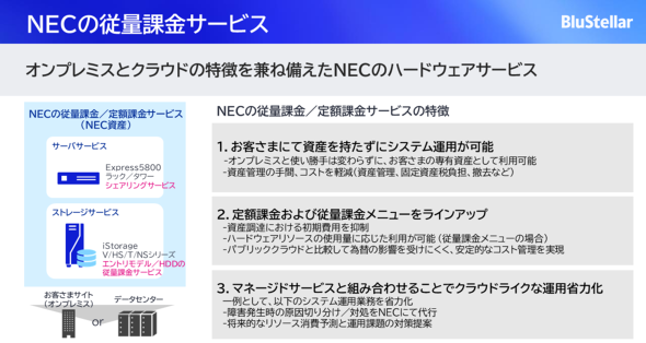 NECの従量課金サービスを使うと、NECのサーバ製品「Express5800」シリーズと、ストレージ製品「iStorage」シリーズを、オンプレミスに導入して占有資産として利用しつつも「所有」しない形式が可能だ。コストを設備投資(CAPEX)ではなく運用経費(OPEX)として計上できる。サーバとストレージをこのような形態で調達することで、初期導入コストを大幅に抑えられる。山岡氏はこう説明する。