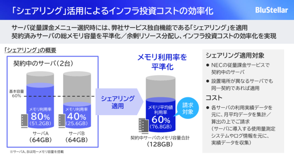 NECの従量課金サービスの中で特徴的なのは、サーバの「シェアリング」という課金方式だ。ユーザー企業がサーバを複数台契約して従量課金で利用する場合、利用料金は各サーバのメモリ利用実績データを基に平均値を算出し、決まる。田中氏は「シェアリングによって、サーバの投資コストを効率化できます。これは、これまでのクラウドやオンプレミスの常識を覆した仕組みです」と強調する。