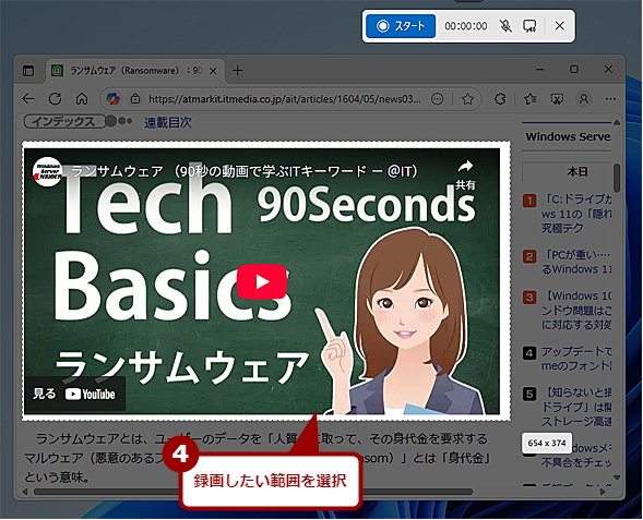 Snipping Toolによる画面録画では、画面上の好きな範囲を「矩形(くけい)」で選択して録画できる。これにより、ウィンドウから開いたダイアログを含めて操作手順が記録できたり、複数のウィンドウを比較しながら説明したりすることが可能だ。