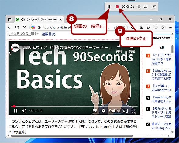 Snipping Toolで画面を録画する(3)Snipping Toolの[スタート]ボタンを押すと、「3」からのカウントダウン後に録画が開始される。タイミングを合わせるのに慣れが必要なので、何回か試してから本番に入るとよいだろう。