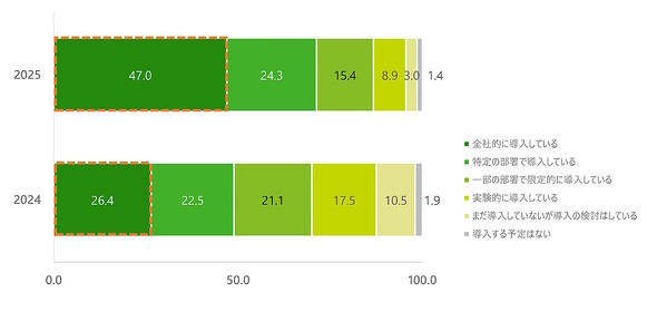 A: 導入済みの企業は95.6%で、前回の87.6%から増加。「全社的導入」は47.0%で、前回の26.4%から大幅に増えた。一方「ほとんどの社員が利用している」は18.5%、「半数以上が利用している」は32.9%にとどまる。