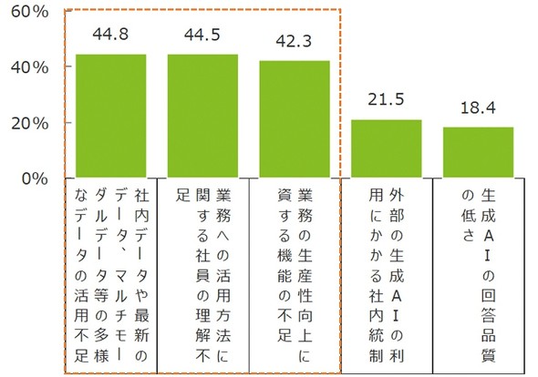 A: 最も多かったのは「専門人材の不足」(45.1%)で、次いで「ガバナンス体制」(35.8%)、「データ整備・AI基盤構築」(27.2%)などが挙がった。
