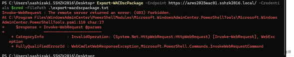 DSC JEAパッケージをエクスポートする場合は、「Export-WACDscPackage」コマンドレットを使用します。クレデンシャルとファイルパスが必須パラメーターになります。アクセスキーは、エンドポイントへの接続時に403エラーが発生したために確認できませんでした。別のアクセスキーを用意しても同様でした。