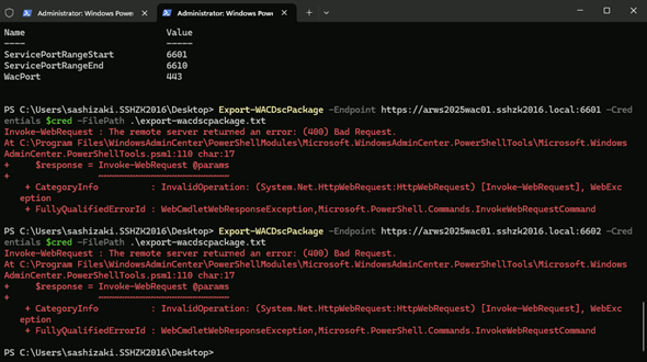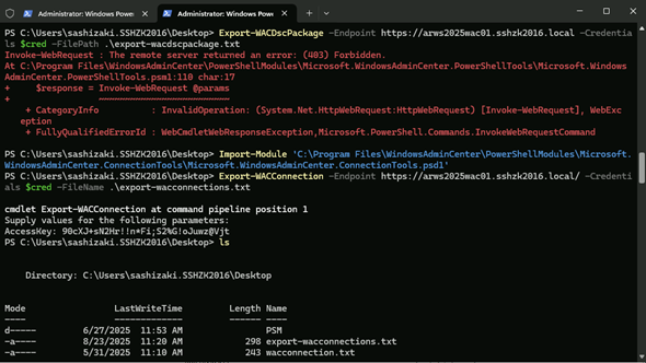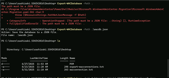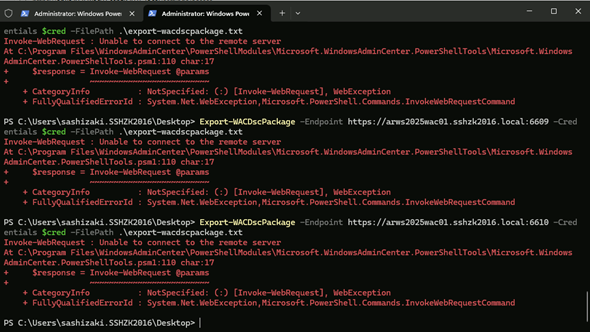 なお、同一のPowerShellウィンドウでExport-WACConnectionコマンドレットを実行したところ、こちらは問題なく接続できました。