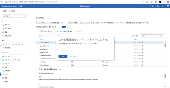 結果は、そのような挙動にならず、Active Directory拡張はアイインストールされたままでした。Windows Admin Centerのサービスを再起動しても状態は変わりませんでした。