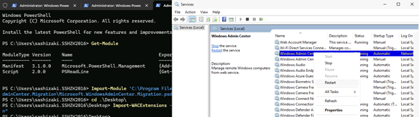 ウィンドウを閉じてから、Microsoft.WindowsAdminCenter.Migrationモジュール、Microsoft.WindowsAdminCenter.Configurationをインポートし、Export-WACSettingsコマンドレットを実行しましたが、無応答になるところは変わりませんでした。