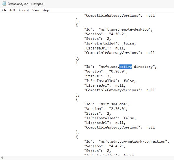 Export-WACExtensionsコマンドレットはJSON形式で出力してくれますが、アンインストールしていたActive Directory拡張とインストール済みの拡張(今回はDNS拡張)の差異を確認しきれませんでした。下記がJSONファイルです。アンインストール済みのActive Directory拡張と、インストールされているDNS拡張は、IDおよびVersion以外での違いは見受けられませんでした。