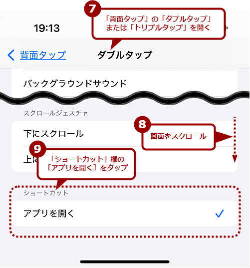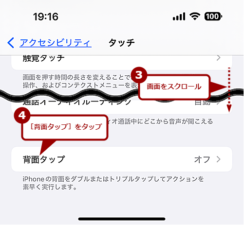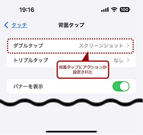 また、背面タップは振動を検知してアクションを実行する機能だが、背面のタップする場所によっては検知されにくいこともある。特に堅牢(けんろう)なケースを使用している場合は、軽いタップだと認識しにくいようだ。そのような場合は、強めにAppleマークの上側をタップするとよい。