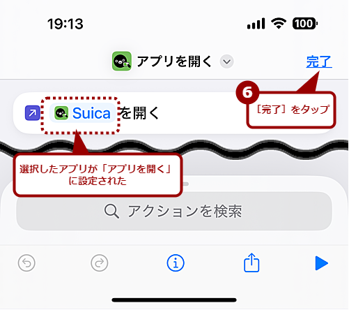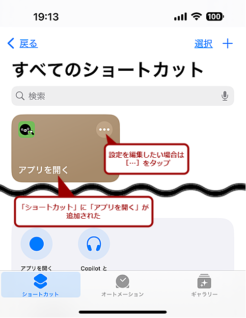 これで「ショートカット」アプリの「アプリを開く」に選択した電子マネーの決済アプリなどが割り当てられる。作成された「アプリを開く」の右上にある[…]アイコンを長押しして、[名称変更]を選択して、ショートカットの名称をアプリ名などに変更しておくと、「アプリを開く」のショートカットを複数作成した場合に、どのアプリの「アプリを開く」なのか分かりやすくなる。