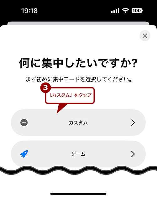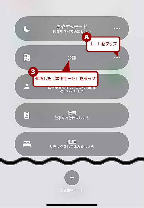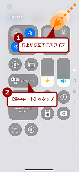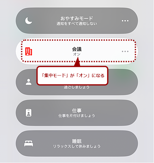 集中モードを設定する(10)設定した「集中モード」を有効にするには、Face ID搭載機の場合は画面の右上隅から下にスワイプ、ホームボタン搭載機の場合は画面の下端から上にスワイプしてコントロールセンターを開く。[集中モード]をタップしてから、「オン」にしたい「会議」などの「集中モード」をタップすればよい。