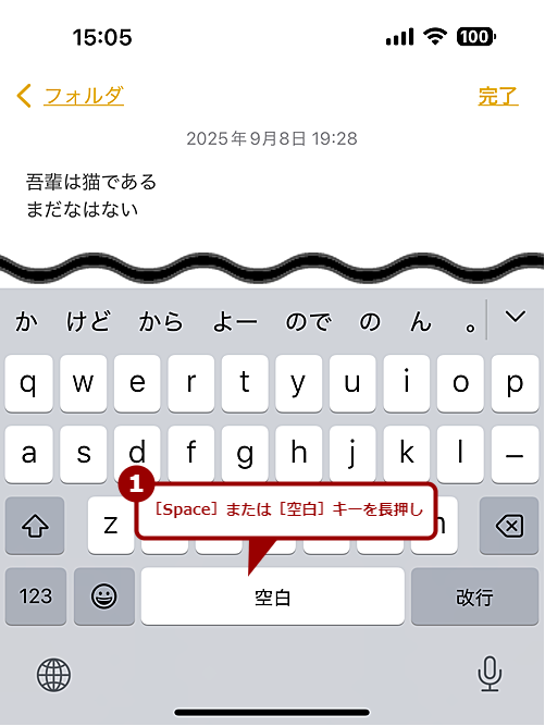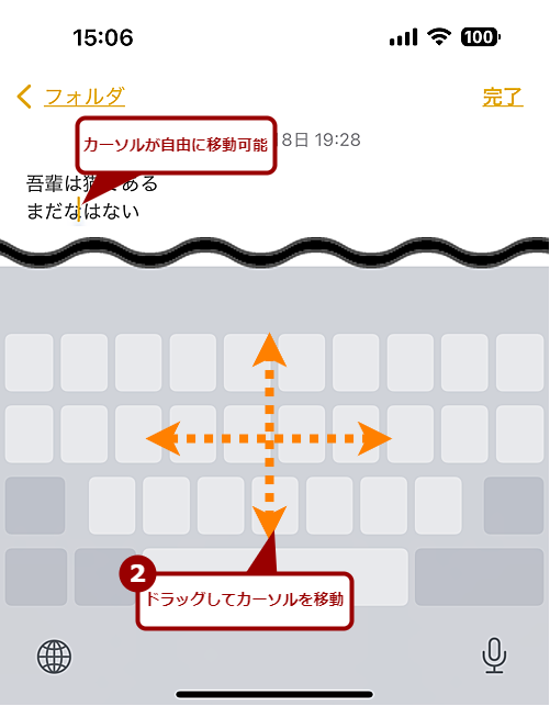 1. キーボードが表示されている状態で、[space]キーまたは[空白]キーを長押し 2. キーボードが灰色に変わったら、トラックパッドのように指でカーソルを動かして、目的の場所までカーソルを移動させて指を離す