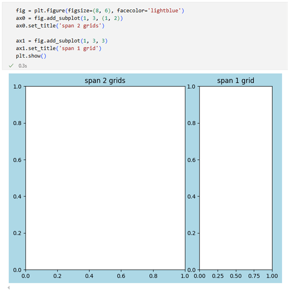 もう1つの(start, end)という形式のタプルを渡すと、startからendの範囲にまたがる領域に単一のAxesオブジェクトを作成できます。こちらも試してみましょう。