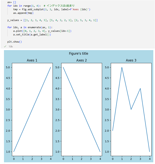 for文の中でadd_subplotメソッドを使い、Axesオブジェクトを順番にFigureオブジェクトに追加していたコードが「ax = fig.subplots(1, 3)」という1行に書き換わっていることに注目してください。ただし、add_subplotメソッドでAxesオブジェクトを作成する際にラベルをそれぞれのオブジェクトにひも付けていましたが、subplotsメソッドで一度にAxesオブジェクトを作成するときにはそうはいきません。そのため、Axesオブジェクトのset_titleメソッドで個々のグラフにタイトルを設定する際に「a.set_title(f'Axes {idx}')」のようにしてグラフのタイトルを指定するようになっています。また、上の典型的な使い方に合わせて、作成したAxesオブジェクトをaxに代入しているので、それを後で使う場面ではfor文の中でループ変数aを使うようにもしています。描かれるグラフは上と同様なので、実行結果は省略します。