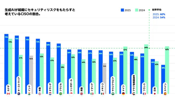 日本のCISOの45%は、企業での活用が進む生成AI(人工知能)が組織にセキュリティリスクをもたらすと回答。41%は、パブリック生成AIプラットフォーム/ツールによる顧客データ流出を懸念しており、コラボレーションプラットフォームや生成AIチャットbotを主要なセキュリティ脅威と見なしていた。
