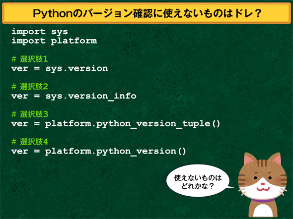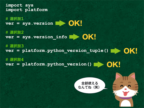 Pythonのバージョンをスクリプト内で確認するには幾つかの方法があります。どんなときにどんな方法を使うのがよいか、分かっているかを試してみましょう。
