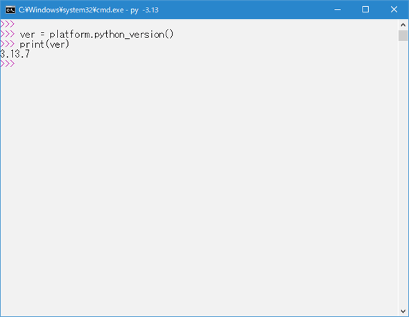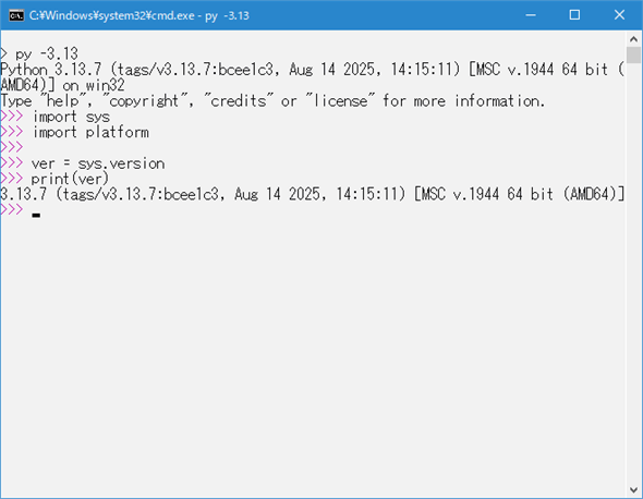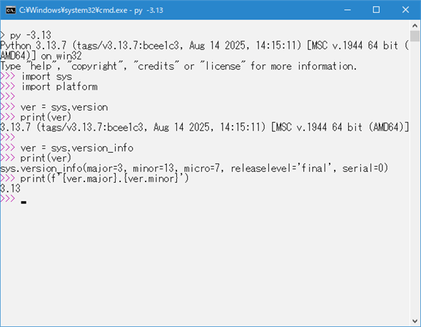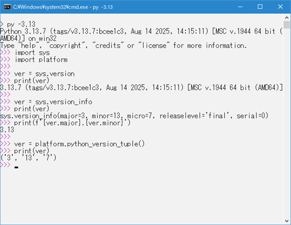 人が目視でPythonのバージョンを確認したり、詳細な情報(コンパイラ情報やビルド日時など)を取得したりするのに適しているといえます。ただし、プログラムでバージョンを抜き出したいのであれば、他の選択肢の方がよいでしょう。