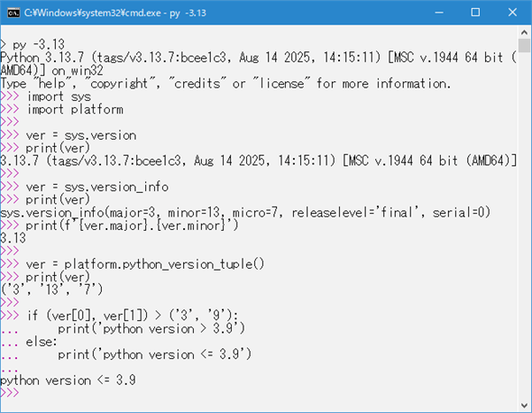 名前付きタプルなので「ver.major」や「ver.minor」のようにして、個別の情報にアクセスが可能です。Pythonのバージョン情報を細かくチェックして、バージョンごとに処理を切り分けたいときにはこれが便利でしょう。