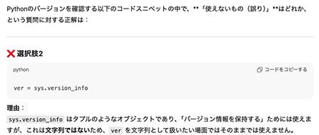 選択肢4の「platform.python_version()」はPythonの「メジャーバージョン.マイナーバージョン.マイクロバージョン」という文字列を返します。Pythonのバージョンが3.13.7なら'3.13.7'という文字列が返されるわけです。