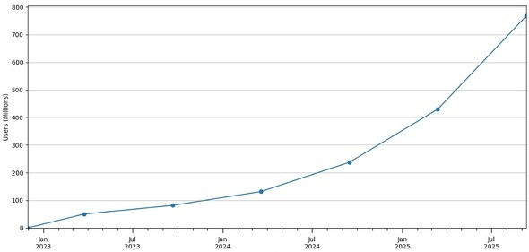 ChatGPTのリリースから1年で週間アクティブユーザー数(WAU)は1億人以上、2年後には3億5000万人に到達した。2025年7月末には、WAUが7億人(世界の成人人口の約10%に相当)を突破したという。