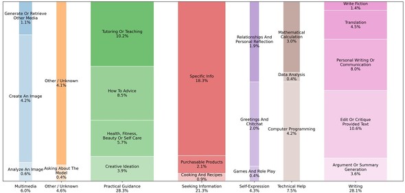 ChatGPTの利用は、主に日常的なタスクをこなすことに集中しており、「実用的なアドバイス」「情報検索」「文章作成」の3つで、約78%を占めていた。
