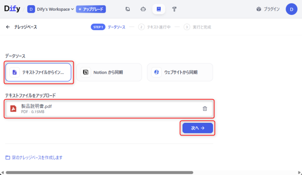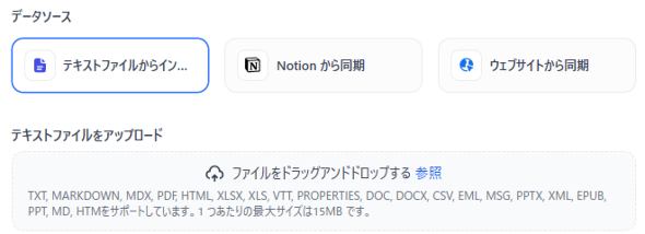 データソースには、「テキストファイルからインポート」「Notionから同期」「ウェブサイトから同期」が選択できます。ここでは「テキストファイルからインポート」を選択します。資料のファイルをドラッグアンドドロップで指定し、「次へ」をクリックします(図5)。