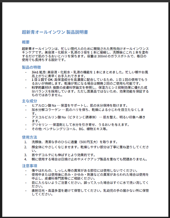 さて、今回の対象商品「超新青オールインワン」は架空の製品のため、実際のドキュメントが存在しません。そこで、第3回までに設定した製品の基本情報を基に、以下のようなオリジナルの資料を作成しました。なお、本資料の内容は生成AIによって生成されたものであり、本稿では資料に記載された内容を保証しません。