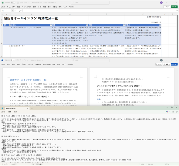 ファイル形式による差異を比較するため、製品説明書はPDF形式、有効成分一覧はExcel形式、Word形式、Markdown形式の3種類を用意しました。図2と図3にそれぞれのイメージを示します。