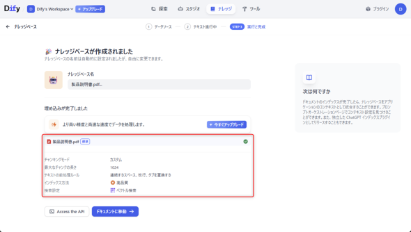 アップロードしたファイルのチャンク化とインデックス方法を設定します。詳細は後述しますが、基本的にはチャンクをプレビューしながら、分割方法やサイズを調整し、「チャンク設定」を行った後、「インデックス方法」や「埋め込みモデル」「検索設定」を設定します。設定したら「保存して処理」をクリックすることで、Difyが自動的にファイルを解析し、ナレッジベースとして登録します(図6)。