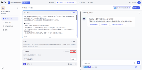 Difyの「スタジオ」から第3回までに作成した「超新青オールインワン カスタマーサポート」アプリを開き、オーケストレーションの「コンテキスト」で「追加」をクリックします(図8)。