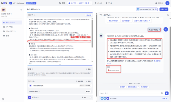 では、プロンプトに設定してあった製品に関する情報を削除した上で、「デバッグとプレビュー画面」で製品情報に関する質問をしてみましょう(図10)。