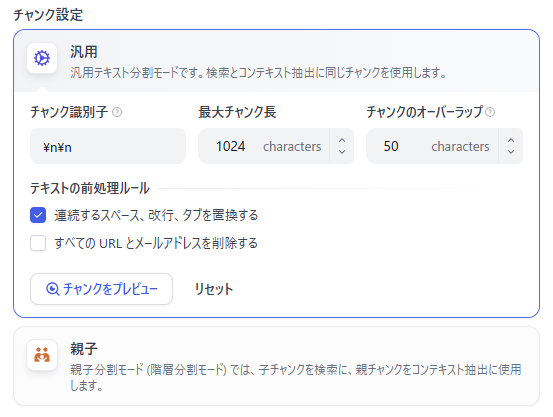 | 最大チャンク長 | 1つのチャンクに含める最大文字数を指定します。これにより、長過ぎるチャンクが分割され、検索時のパフォーマンス向上が期待できます。デフォルトは1024文字です。 |