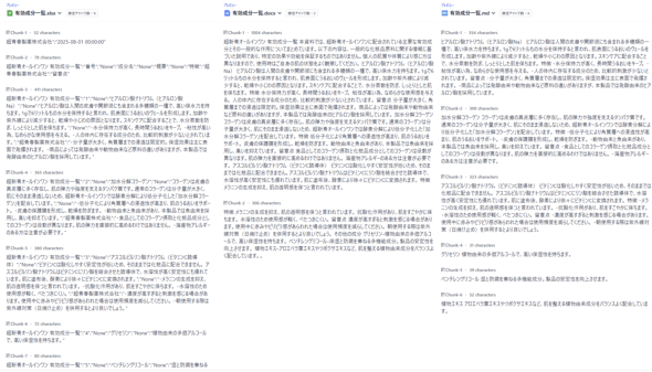 半面、Word形式は、文書に「表題」や「見出し」といった構造化情報を含んでいるにもかかわらず、連続した文字列だと見なされ、最大チャンク長の1024文字で分割されてしまいました。オーバーラップで指定した程度の長さの文字列が第2チャンクにも含まれていることが確認できます。チャンクは成分ごとに分割されていないため、成分ごとの検索性は低いと考えられます。