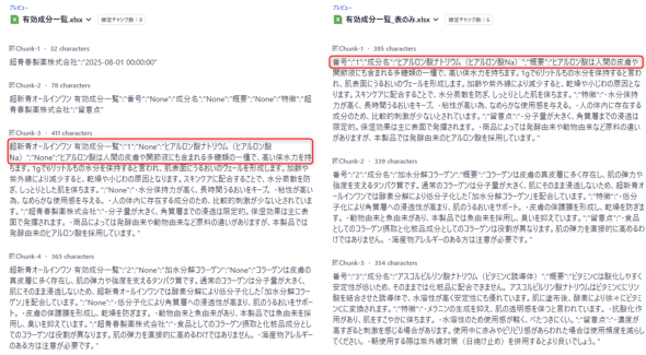 元のファイル(左)に比べ、表だけにしたファイル(右)はチャンクの内容が「"列見出し":"セルの値";」とうまく構造化されていることが確認できます。このような構造をとることができれば、単純なテキストの羅列よりLLMによる解釈が容易になり、回答精度も向上することが期待できます。