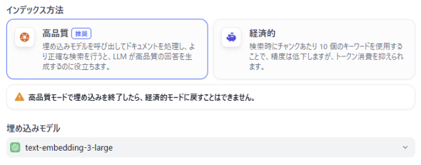 Difyでは、インデックス方法を「高品質」と「エコノミー(経済的)」の2種類から選択できますが、「高品質」が推奨であり、RAGで一般的に利用される「ベクトル検索」がこちらに相当するので、ここでは「高品質」についてのみ説明します。