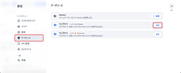 Difyの「設定」を開き、「データソース」の「ウェブサイト(によるJina Reader)」を選択します(図19)。日本語はおかしいですが by Jina Readerの直訳でしょう。