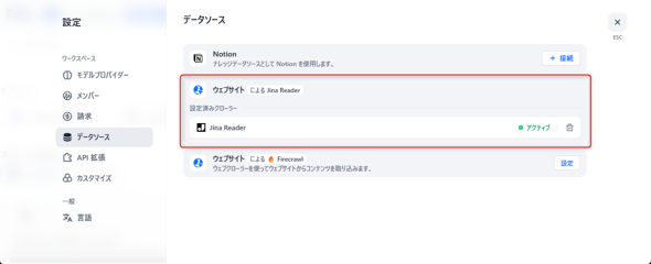 「アクティブ」という表示に変われば、データソースとしてJina Readerが利用できるようになります(図21)。