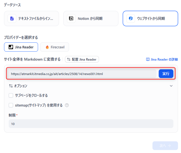 Webサイトからデータを取得してみます。ナレッジベースの作成画面で「ウェブサイトから同期」を選択し、URLを入力します。ここでは、前回記事のURLを入力してみました(図22)。