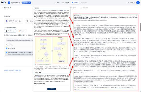「実行」を押すと、Jina ReaderがWebサイトをスクレイピングし、その結果が右側に表示されます。きれいにMarkdown形式で記事を取得できていることが分かります(図23)。ただh2やh3などの見出し情報は省略されています。