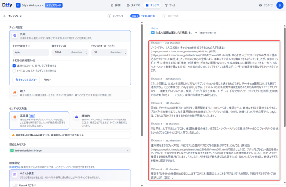 Difyでチャンク化を行う際に調整可能なパラメーターは表1の通りです。これらの設定を調整することでチャンク化の挙動をある程度カスタマイズできます(図11)。