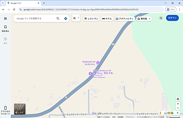 実際、Googleマップで確認すると、いまでは一面のぶどう畑が広がっています。ちなみにGoogleマップには、O’Rear氏が壁紙の写真を撮影した場所が「有名なWindows XPの「Bliss」壁紙写真の撮影場所」としてピンが立っています。ストリートビューで2007年〜2024年の丘の風景が確認できますよ。