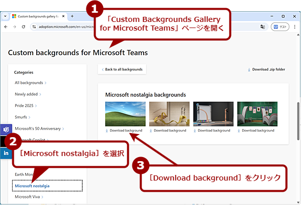 Googleマップのソノマからナパに向かう道また、Windows 11でWindows XPの壁紙を利用したい場合は、Microsoftの「Custom Backgrounds Gallery for Microsoft Teams」ページを開き、左メニューで「Microsoft nostalgia」を選択するとダウンロード可能です。ただし、Windows XPの壁紙と比べると、空の感じとか違っています。これは、Microsoft Teamsのチームが、オンライン会議向けに空や丘の高さや影などを修正したからだそうです。オリジナル通りでないのが残念です。