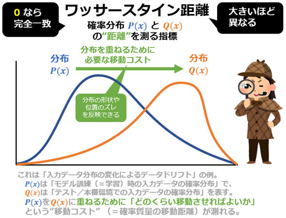 2つの確率分布間の“距離”を測る指標で、「ある分布をもう一方に重ねるために、どれだけ“確率質量”を動かす必要があるか」を表す。値が0なら「完全一致」、大きいほど「異なる」ことを意味する。主に統計学や機械学習で使われ、データドリフト検出や生成モデル(WGAN)などに応用される。別名「アースムーバー距離」。