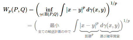 この式の意味を平易に言い換えると、「分布Pを分布Qに変えるためのあらゆる輸送計画を考え、その中で“輸送コスト”が最も小さいものを選び、その大きさを“距離”として採用する」ということである。ここでの“輸送コスト”とは、「距離|x−y|のp乗」と「運ぶ“確率質量”」とを掛け合わせ、全て合計した値である。