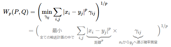 この数式の意味は、「分布Pの値ごとに、どのくらいの“確率質量”を分布Qの値へ運ぶか」を考え、それぞれにかかるコスト(=距離のp乗×運ぶ量)を全て合計するということである。そして、その合計が最も小さくなるような運び方を選んだときの値が、ワッサースタイン距離となる。