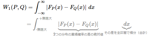この数式の意味は、「分布Pと分布Qの累積分布関数の差」を数直線上の全てのxについて調べ、その差の大きさを積分(=全区間で合計)するということである。直感的には、数直線上のあらゆる点で「一方の分布Pがもう一方の分布Qに対してどのくらい進んでいるか、あるいは遅れているか」を測り、そのズレを合計したものがワッサースタイン距離W1になる。
