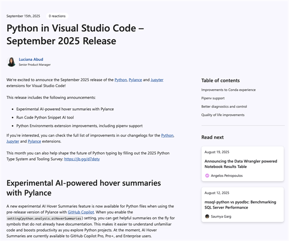 Python in VS Codeの2025年9月版のリリースブログ今回のリリースで発表された主な機能は以下の通りだ。