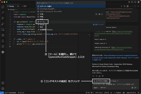 Run Code Snippet AI toolを試すためにはチャットパネルで[コンテキストの追加]ボタンをクリックし、コマンドパレットから[ツール]を選択する。その後、コマンドパレットに「pylanceRunCodeSnippet」と入力するその後、チャットボットにコードスニペットを実行するよう伝えると、チャット内でそれを実行してくれる。このときにPythonの実行環境などは自動的に適切なものが選ばれるようだ。